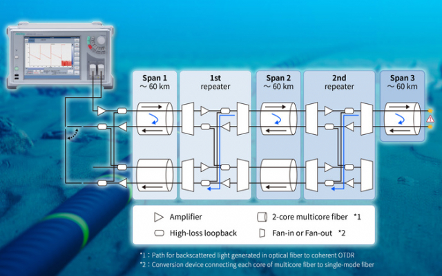 ÀÌ ½ÇÇè¿¡¼´Â ½Ì±Û ¸ðµå ±¤ÆÄÀ̹ö¿Í µ¿ÀÏÇÑ ¹æ½ÄÀ¸·Î ÄÚÈ÷¾î·±Æ® OTDRÀ» »ç¿ëÇØ ¸ÖƼÄÚ¾î ±¤ÆÄÀ̹öÀÇ ±¤¼±·Î Ư¼ºÀ» ÃøÁ¤ÇÒ ¼ö ÀÖ´ÂÁö ½ÇÇèÇß´Ù. KDDI ¸®¼Ä¡´Â ¸ÖƼÄÚ¾î ±¤ÆÄÀ̹ö¸¦ »ç¿ëÇÏ´Â °æ¿ì¿¡µµ ÄÚÈ÷¾î·±Æ® OTDRÀ» ÀÌ¿ëÇÑ ÃøÁ¤ÀÌ °¡´ÉÇÑ Àü¼Û ½Ã½ºÅÛÀ» »õ·Ó°Ô ¼³°èÇϰí, ÇØÀú ±¤ÄÉÀÌºí ºÐ¾ßÀÇ Ç³ºÎÇÑ ¿¬±¸ °æÇè°ú Àü¹® Áö½ÄÀ» Ȱ¿ëÇØ ¸ÖƼÄÚ¾î ±¤¼¶À¯¸¦ ÀÌ¿ëÇÑ ÇØÀú ±¤ÄÉÀÌºí ½Ã½ºÅÛÀÇ ½Ã¹Ä·¹ÀÌ¼Ç È¯°æÀ» ±¸ÃàÇß´Ù. ÀÌ ½Ã¹Ä·¹ÀÌ¼Ç È¯°æ¿¡¼´Â ¾È¸®¾²ÀÇ ¡®ÄÚÈ÷¾î·±Æ® OTDR MW90010B¡¯¿¡¼ Àü¼ÛµÈ ÃøÁ¤±¤ÀÌ ¸ÖƼÄÚ¾î ±¤¼¶À¯¸¦ ÅëÇØ ÀüÆÄµÈ´Ù. °¢ ÄÚ¾î ³»¿¡¼ ¹ß»ýÇÏ´Â ¹Ý»ç±¤°ú »ê¶õ±¤Àº ÄÚÈ÷¾î·±Æ® OTDR·Î µÇµ¹¾Æ¿Í ¼ö½Å ¹× ºÐ¼®ÇØ ±¤¼±·Î Ư¼ºÀ» ÃøÁ¤ÇÑ´Ù.